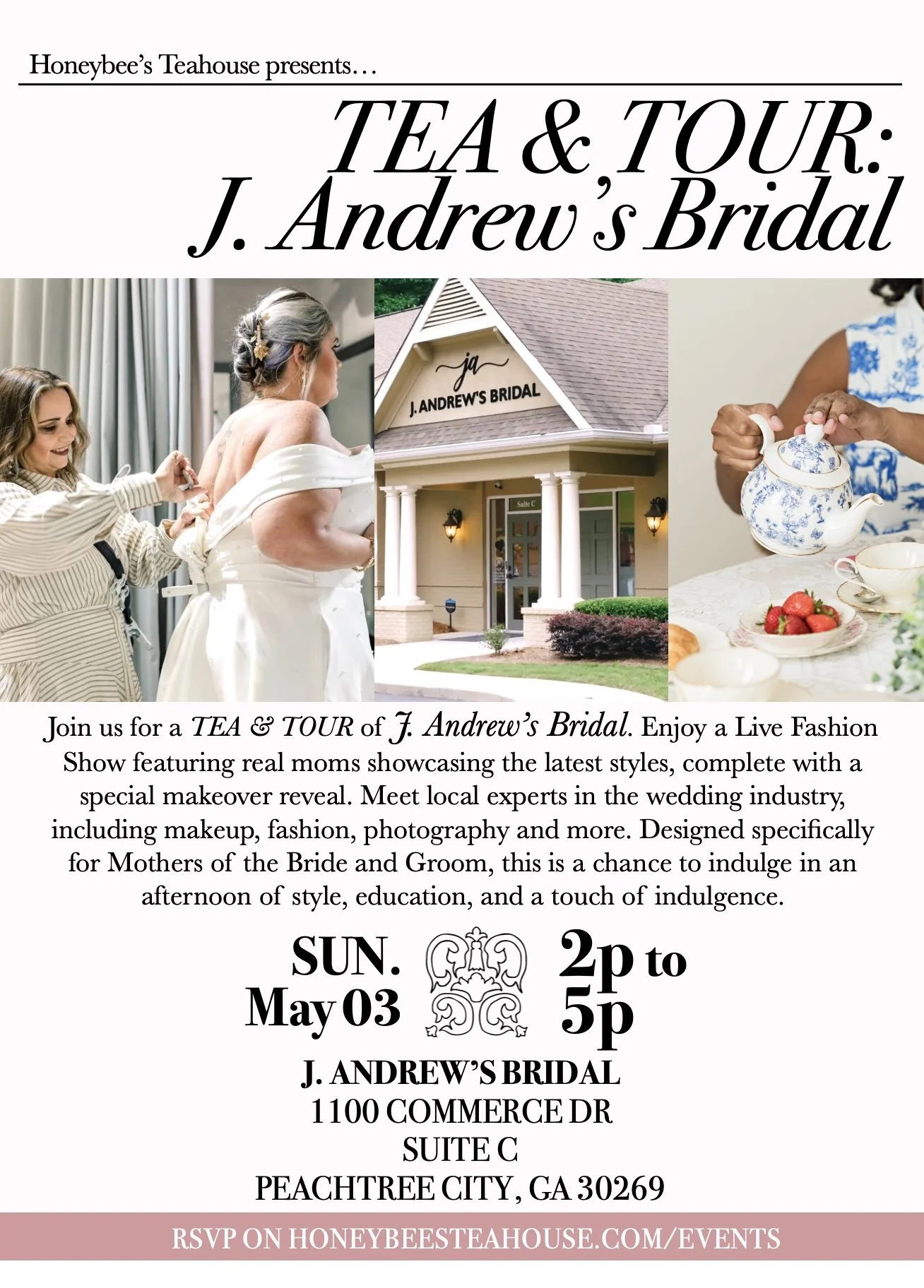Join us for a TEA & TOUR of J. Andrews Bridal. Enjoy a Live Fashion Show featuring real moms showcasing the latest styles, complete with a special makeover reveal!